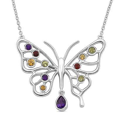 Evoking the charm of butterflies, this LucyQ butterfly-inspired necklace embodies nature's beauty and charm that captures attention. It is also believed to have a symbolic association with transformation and hope, making it a meaningful piece of jewellery. This multicoloured necklace features garnet, peridot, citrine and African amethyst that radiates true craftsmanship and play of colours. Crafted from hypoallergenic 925 sterling silver, this ensures comfort and durability. The rhodium overlay on sterling silver offers lasting shine and a lustrous finish. Comes with a secure lobster clasp for a safe and comfortable fit, allowing you to wear it throughout the day. Ideal jewellery piece for personal styling and meaningful gifting for a lasting impression. Add a pop of colours to your jewellery collection with this LucyQ butterfly collection.