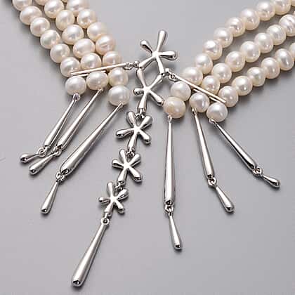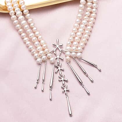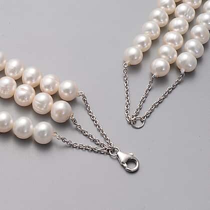 LucyQ Pearl Splash Collection - White Freshwater Edwardian Pearl Statement Necklace (Size 24) in Rhodium Overlay Sterling Silver, Silver Wt. 14.50 Gms