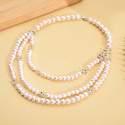This otherworldly triple-strand freshwater pearl necklace will light up her radiant beauty in the glow of the lovely pearls. The solid silver floral drops interspersed with the pearl strands bring a healthy distraction to the necklace crafted in fine silver. Rhodium overlay ensures that silver never loses its elegance and clothes it in a polished look that complements the sheen of the pearls.