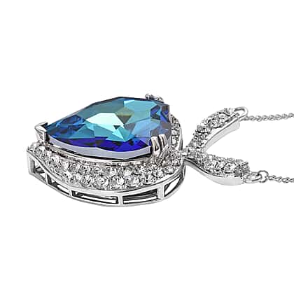 Lustro Stella - Bermuda Blue Crystal (Hrt), White Crystal Heart Necklace (Size 18 with 2 inch Extender) in Platinum Overlay Sterling Silver, Silver wt 18.22 Gms