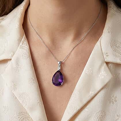 Luxuriant - SI-G-H Lab Grown Diamond & African Amethyst Pear Cut Solitaire Pendant with Chain (Size 20) in Rhodium Overlay Sterling Silver 28.31 Ct.