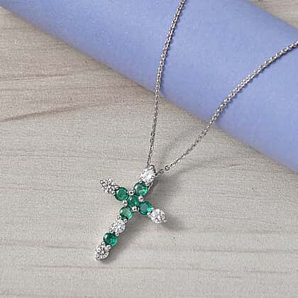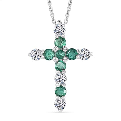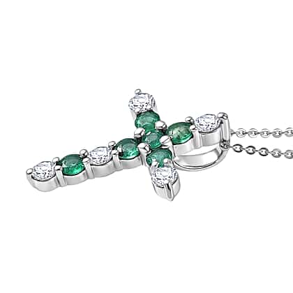 Luxuriant AAA Gemfields Zambian Emerald & SI-GH Lab Grown Diamond Cross Pendant with Chain (Size 20) in Rhodium Overlay Sterling Silver 1.18 Ct.