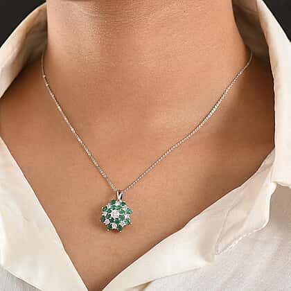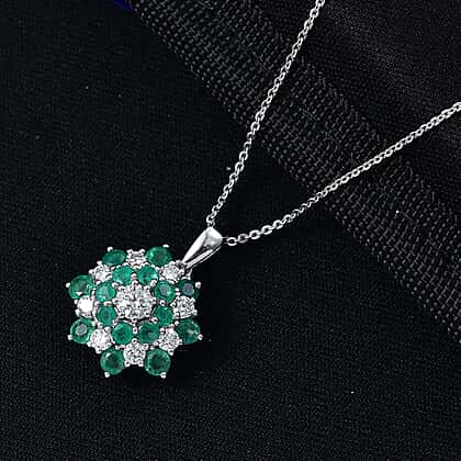 LUXURIANT AAA Gemfields Zambian Emerald, Lab Grown Diamond Floral Pendant with Chain (Size 20) in Rhodium Overlay Sterling Silver 2.27 Ct. (SI-GH)