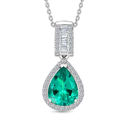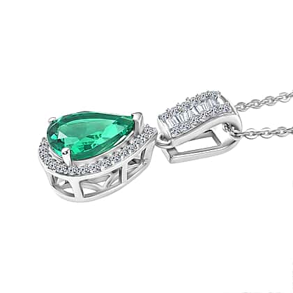 Luxuriant Lab Grown AAAA Colombian Emerald & Lab Grown Diamond (SI-GH) Pear Cut Pendant with Chain (Size 20) in Rhodium Overlay Sterling Silver 1.68 Ct.