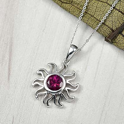 Unveil the charm of this sunburst-inspired pendant, a perfect touch of beauty for your jewellery collection. Featuring a lab-grown bixbite in a raspberry red hue, lying at the heart of the piece, complemented by a silver-tone sunburst design. Exclusively crafted in rhodium plating over 925 sterling silver, this piece ensures a shine and polished finish. The striking mirror-like finish makes the piece perfect for adding a pop of colour and class to any outfit. The hypoallergenic properties of the metal make the earring safe and secure for sensitive skin. Ideal for everyday wear, special occasions, or gifting, this bold jewellery piece transforms your outfit.