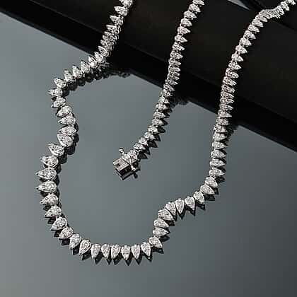 This stunning lab grown diamond necklace is a brilliant piece of jewellery, designed to offer both elegance and durability. Crafted from hypoallergenic and tarnish-resistant rhodium overlay sterling silver, the necklace features 250 sparkling lab-grown diamonds that offer the brilliance of natural diamonds with a more eco-friendly footprint. The design features a series of teardrop-shaped diamonds, meticulously set to enhance their radiance, while the 16.5-inch length ensures a perfect fit for any occasion. Whether dressing up or down, this necklace adds a touch of luxury to your look, making it an essential accessory for the modern woman.