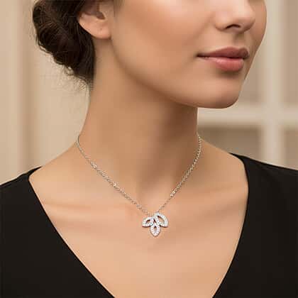 A beautifully sculpted pendant shaped with a soft leaf design, each traced with shimmering lab-grown diamonds that bring radiant sparkle from every angle. The open petal layout gives the piece a light, airy presence, allowing the design to sit gracefully on the neckline. Its nature-inspired curves create a modern, uplifting look suited to both relaxed and polished outfits. Crafted in rhodium overlay on 925 sterling silver, this pendant offers durability and enduring shine. Its hypoallergenic nature provides comfort and safety to sensitive skin. Paired with a smooth chain, this pendant becomes a standout accent that blends shine, artistry, and gentle fluidity with ease.