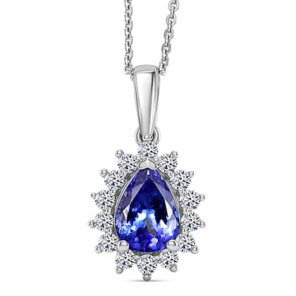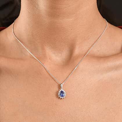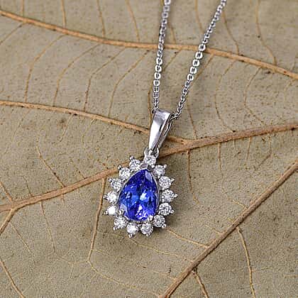 Luxuriant Tanzanite & SI-G-H Lab Grown Diamond Pear Cut Halo Pendant with Chain (Size 20) in Rhodium Overlay Sterling Silver 1.54 Ct.