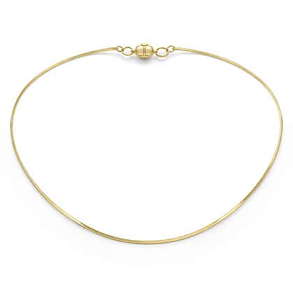 Presenting the flat snake necklace from the maestro collection to uplift your fashion game. Meticulously crafted in 9K yellow gold plating, this necklace ensures durability and lasting shine. The hypoallergenic properties of the metal make the piece safe and secure for sensitive skin. The smooth texture with fluid drape sits beautifully on the neckline, creating a striking statement piece. The subtle finish with a yellow tone captures light, making it ideal for wearing solo or layering. The spring ring clasp with magnetic lock ensures security and comfort, making it a perfect piece for everyday styling and gifting on special occasions.
