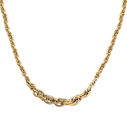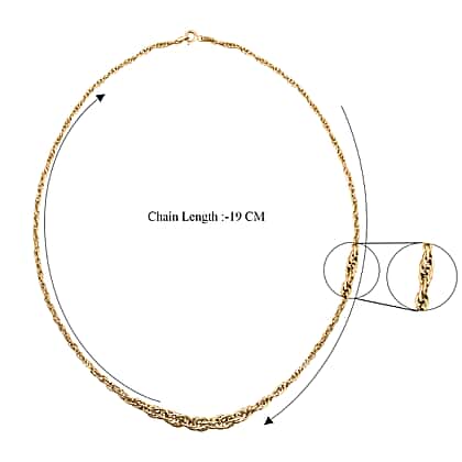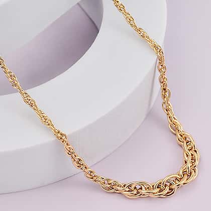 You are looking at a golden Prince of Wales necklace that amazes you with an intricate interlocking pattern of links, which is inventive and unique. The necklace is presented in a series of small, elongated oval links delicately intertwined to create a beautiful chain. This design gives the necklace a sense of fluidity and movement, allowing it to drape gracefully around your neck and clothe it in a regal aura.