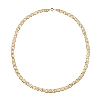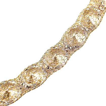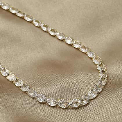A magical design with sparkling gemstones peeking through, this 9K Yellow Gold Cubic Zirconia Crochet Necklace radiates subtle glamour. Threads of gold have been crocheted to create the gorgeous Size 20 necklace, with the gleaming weave holding 60 oval Cubic Zirconias within. The intricate artistry of the necklace sets it apart from other pieces of jewellery.