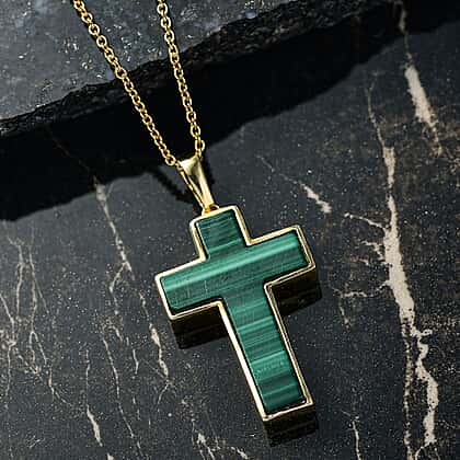 Malachite Cross Pendant with Chain (Size 20) in Yellow Gold Plated 21.82 Ct.