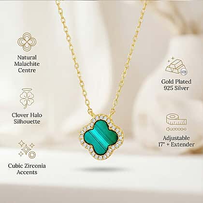 Malachite, Cubic Zirconia Clover Halo Necklace (Size - 17 Inch with Ext) with Lobster Clasp in Gold Plated Sterling Silver
