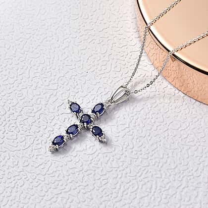 Masoala Sapphire & White Zircon Cross Pendant with Chain (Size 20) in Rhodium Overlay Sterling Silver 1.89 Ct.