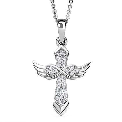 Moissanite Angel Wings Pendant with Chain (Size 20) in Platinum Overlay Sterling Silver