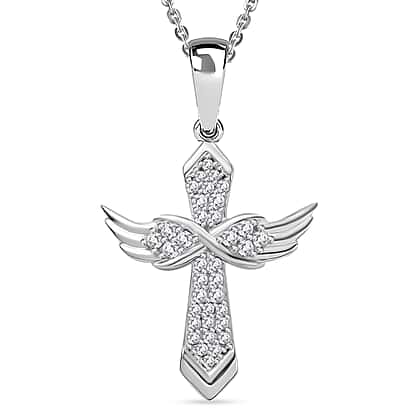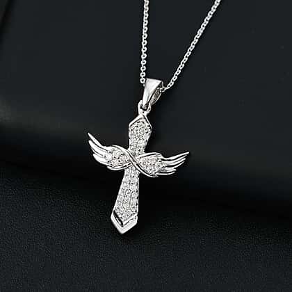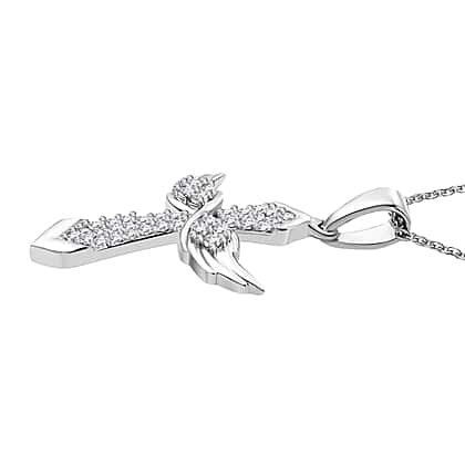Moissanite Angel Wings Pendant with Chain (Size 20) in Platinum Overlay Sterling Silver