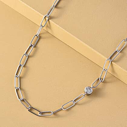 Paper clip necklaces come in a pattern of interlocking the paper clips together. This necklace comes with Moissanite stone at one side in Bezel fit setting. The necklace is made up of sterling silver in size 18 inches. The necklace will be settling on the collarbone.