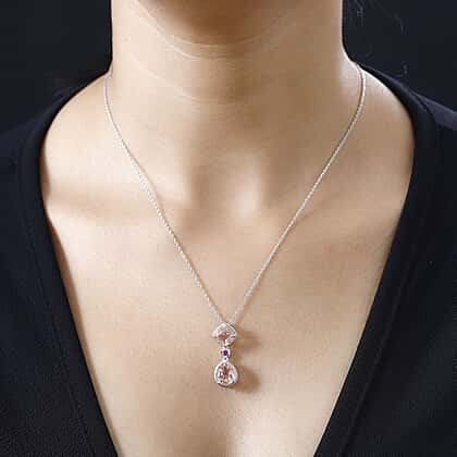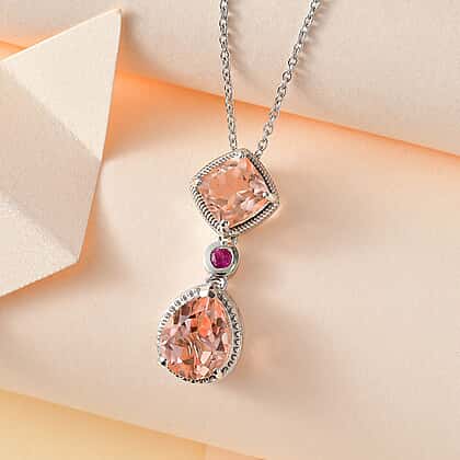 Featuring a morganite quartz cushion and pear in faceted cut, alongside a fissure filled ruby, this pendant is set in platinum-overlay sterling silver, known for its resistance to abrasions and scratches. The added value of the size 20 chain ensures that this piece is not just a pendant but a statement of style that enhances the wearing experience, offering a luxurious feel to the wearer.