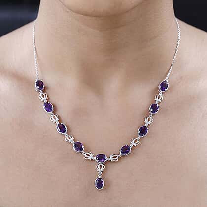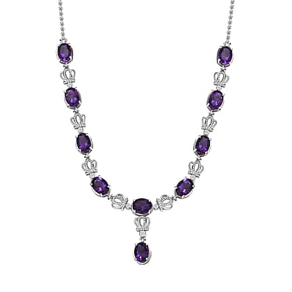 Embrace the majestic allure of the Moroccan amethyst Necklace, a true testament to elegance and craftsmanship. This exquisite 20-inch necklace features a harmonious blend of rich amethyst and sparkling zircon, set in a delicate chain with unique crown-shaped links. Its 20-inch length drapes gracefully, offering a regal touch to any outfit. The secure lobster claw clasp ensures both comfort and peace of mind. With its platinum overlay on sterling silver, this necklace is the epitome of luxury and style.