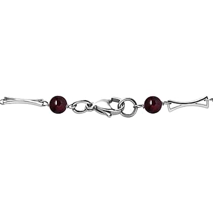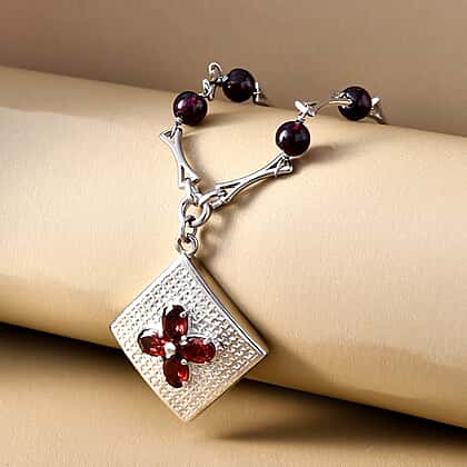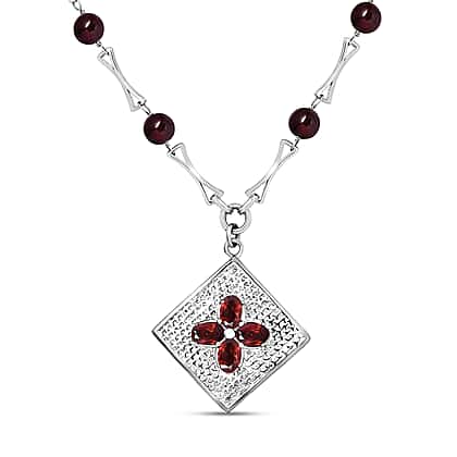 This stunning necklace boasts a beautiful array of 24 Mozambique and rhodolite garnets. The size 18 necklace features a distinct design with 20 cabochon beads of the rhodolite garnets interspaced with slim hourglass-shaped bands of pure white brass in silver tone. The pendant of the necklace has 4 oval Mozambique garnets set like a flower on a diamond-shaped white brass design.
