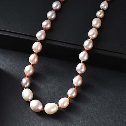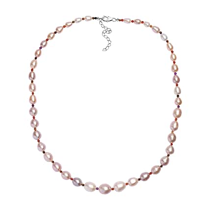A soft and stunning necklace crafted with multi-colour freshwater pearls complemented by delicate gemstone spacers for a gentle hint of contrast. The naturally varying pearl shades bring a warm, feminine glow, making this a versatile piece that suits everyday wear and special occasions. Finished with a rhodium overlay on a 925 sterling silver clasp, the necklace offers durability and a refined finish with added tarnish resistance. The metal has hypoallergenic properties, making the piece safe and secure for sensitive skin. The 18-inch length with a 2-inch extender ensures comfortable and adjustable styling.