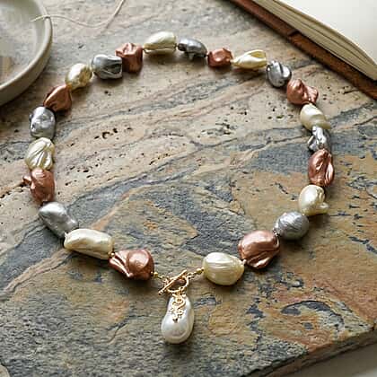 Multi Color Shell Pearl & White Crystal Necklace (Size - 20.5) with T-Bar Clasp in Yellow Gold Tone