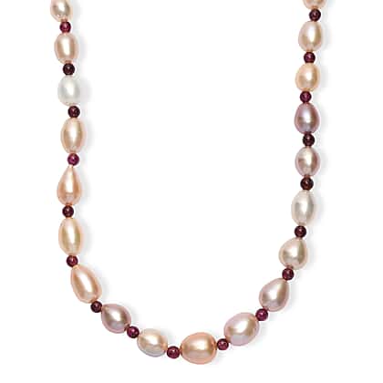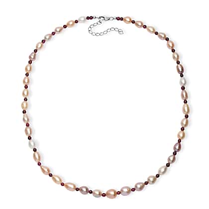 Multi Colour Fresh Water Pearl & Red Garnet Necklace (Size 18 - 2 Ext) with Lobster Clasp in Rhodium Overlay Sterling Silver 100.00 Ct.