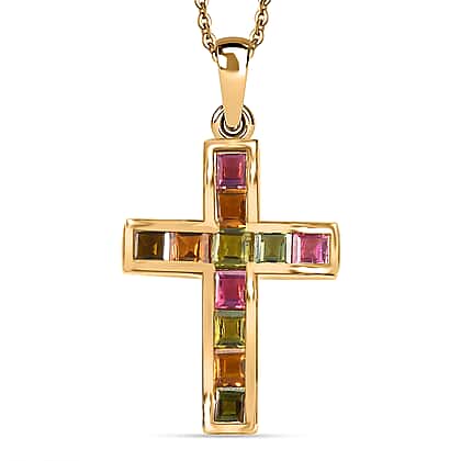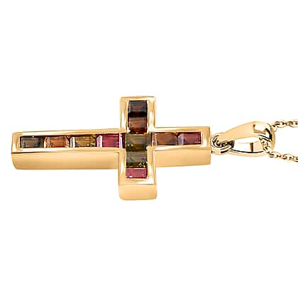 Multi-Tourmaline Cross Pendant with Chain (Size 20) in 18K Yellow Gold Plated Vermeil Sterling Silver