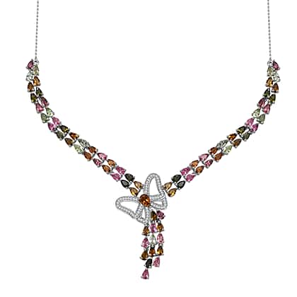 A magical array of gemstones lights up this Multi-Tourmaline & Zircon Cluster Necklace that is lovingly crafted out of Rhodium Overlay Sterling Silver. The Size 20 necklace, set with 141 gemstones, features a lariat drop design studded with multi-tourmalines. The drop is adorned with a butterfly shaped from silver and studded with dazzling zircons,