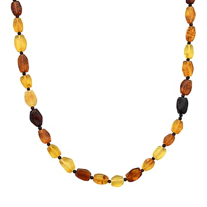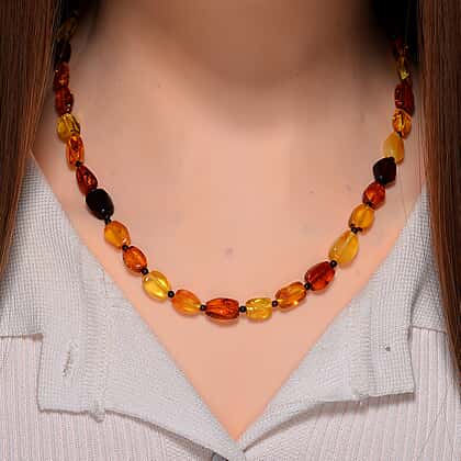 This exquisite Natural Baltic Amber necklace offers a harmonious blend of earthy hues ranging from honeyed yellows to deep browns. Each amber bead showcases its unique texture and warmth, forming a timeless design that radiates natural charm. The necklace is secured with a sterling silver magnetic clasp, combining convenience with elegance. Amber, known for its historical value and soothing energy, makes this piece a perfect choice for collectors and enthusiasts alike. Hypoallergenic and tarnish-resistant, the sterling silver ensures a long-lasting shine, making it suitable for sensitive skin. Elevate your accessory collection with this statement piece.