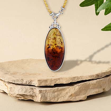 - GEMSTONE DETAILS: Brilliance and fire is offered to this necklace through 100 carats of Baltic Amber in free cabohon cut and beaded form. The free cabochon cut gemstone has been studded onto this pendant through bezel setting