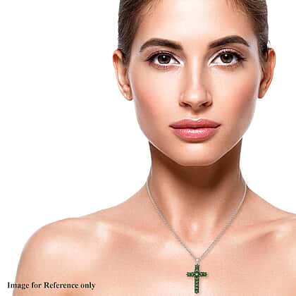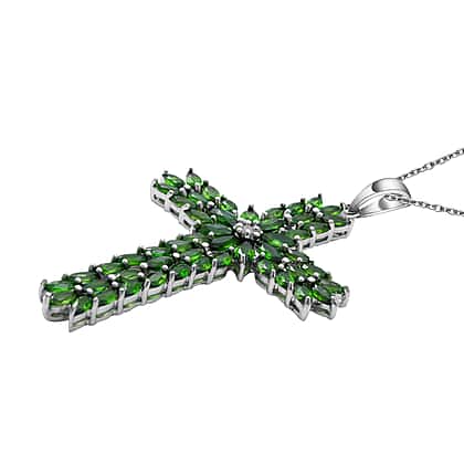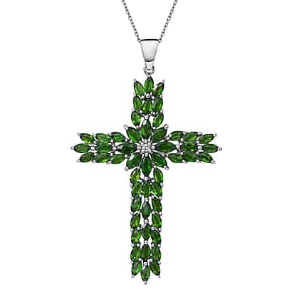 The holy cross-inspired natural chrome diopside pendant is a must-have piece of jewel to add to your jewellery collection. This pendant is encrusted with marquise-cut gemstones secured in a prong setting exhibiting lush green colour. It is crafted from 925 sterling silver with a rhodium overlay and an 18-inches long chain secured with a lobster clasp. Style it every day to complement the look of your outfit.