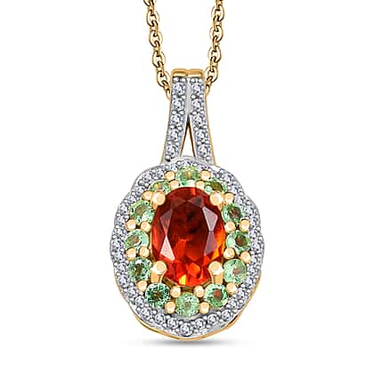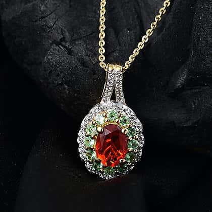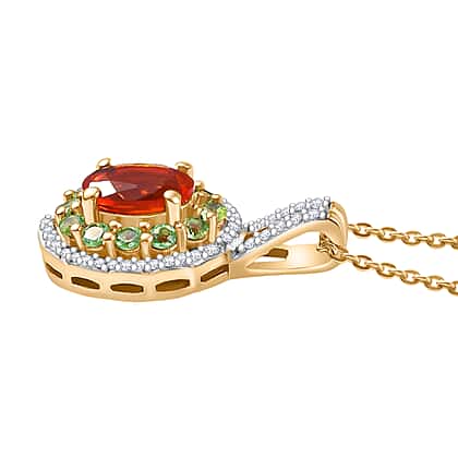 Natural Crimson Fire Opal, Tsavorite Garnet & White Zircon Acroclinium Bloom Pendant with Chain (Size 20) in 18K Vermeil Yellow Gold Plated Sterling Silver 1.13 Ct.