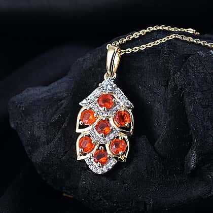 Natural Crimson Fire Opal & White Zircon Leafy Elegance Pendant with Chain (Size - 20) in 18K Vermeil Yellow Gold Plated Sterling Silver 1.02 Ct.