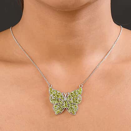 Natural Hebei Peridot and Natural Cambodian Zircon Butterfly Necklace (Size 18 with 2 Inch Extender) in Platinum Overlay Sterling Silver 9.51 Ct, Silver Wt. 9.42 Gms