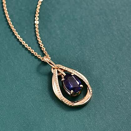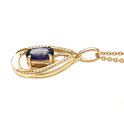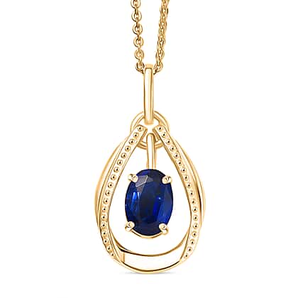 Displaying beauty in every curve with this stunning pendant, featuring natural kashmir kyanite in a teardrop design. The contrast of the deep blue hue of Kashmir kyanite with 18K yellow gold plating creates a luxurious piece. Meticulously crafted in hypoallergenic 925 sterling silver, this pendant ensures durability and comfort for sensitive skin. The intricate teardrop design frames the gemstones beautifully, adding a touch of grace and sophistication. Features a gold-tone chain for versatile wear and a lobster clasp for a comfortable fit throughout the day. A perfect piece showcases the exceptional craftsmanship, making it ideal for special occasions and luxurious gifting.