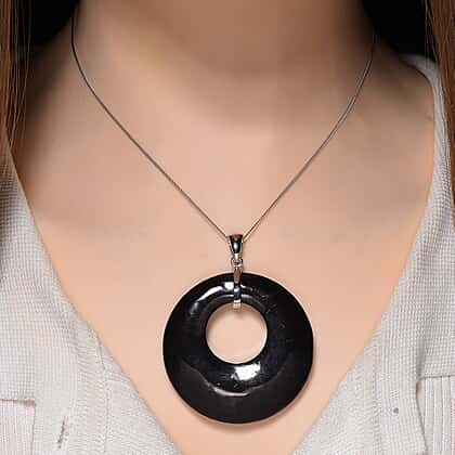Artful and sculptural, this black natural shungite pendant will make for one of the most unique and exquisite pieces to your repertoire. It features a smooth, round disc-like stone with a cutout at the centre. The charm has a hollow frame and looks incredibly glossy. Further the cabochon-cut of the shungite stone makes the central stone appear more bold and denser. The black charm is attached to a minimalistic rhodium overlay sterling silver bail and chain. Style it with a jeans and blazer or your trusted LBD to elevate your look in a jiffy!