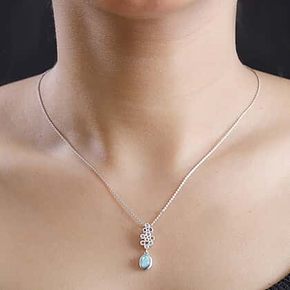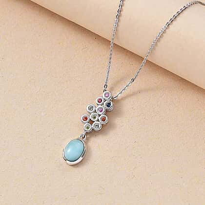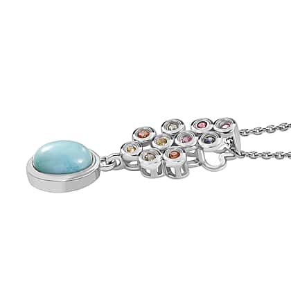 Natural Teal Green Larimar & Multi Sapphire Pendant with Chain (Size - 20) in Rhodium Overlay Sterling Silver 1.20 Ct.