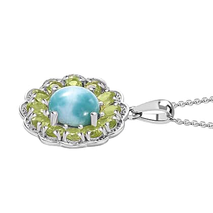 Natural Teal Green Larimar & Peridot Pendant with Chain (Size - 20) in Rhodium Overlay Sterling Silver 5.61 Ct.