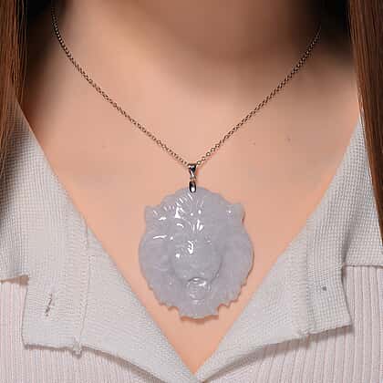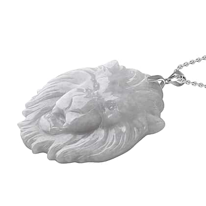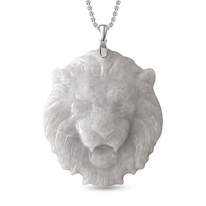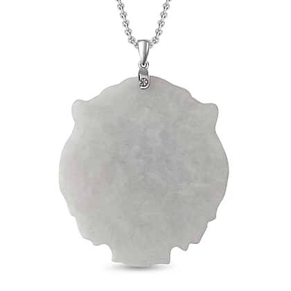 Natural Type A Jadeite Carved Lion Pendant with Chain (Size - 20) with Lobster Clasp in Rhodium Overlay Sterling Silver 129.00 Ct.