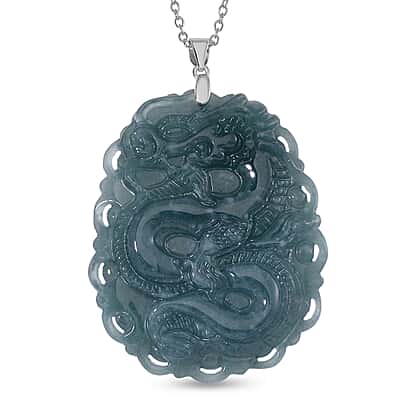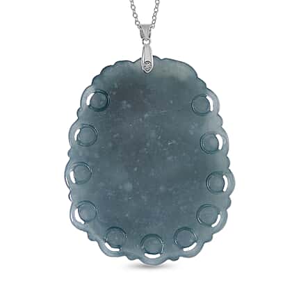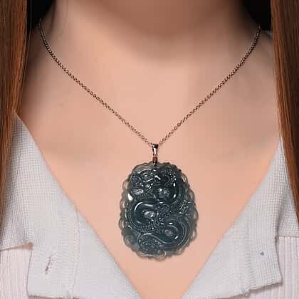 Natural Type A Olmec Jadeite Dragon Pixiu Carved Pendant with Chain (Size 20) in Rhodium Sterling Silver 100 Ct.