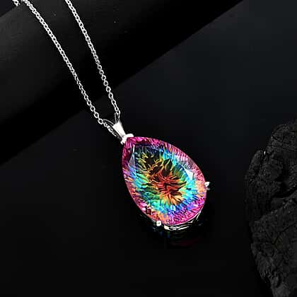 Capture the world of cosmic brilliance with this Nebula quartz doublet solitaire pendant, a true statement of elegance and wonder. The pear-shaped gemstone bursts with an iridescent spectrum of colours, creating a mesmerising celestial effect. Set in rhodium overlay sterling silver, this pendant offers lasting shine, hypoallergenic properties, and resistance to tarnish. The solitaire setting symbolises individuality and strength, making it perfect for those who embrace their uniqueness. Suspended from a sleek 20-inch chain, this piece is a radiant addition to any jewellery collection, effortlessly blending contemporary charm with timeless sophistication.