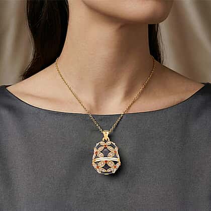 Orange Crystal, Enamled & White Resin Pearl Floral Egg Pendant with Chain (Size 24-2 Ext) in Yellow Gold Tone