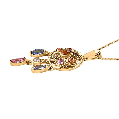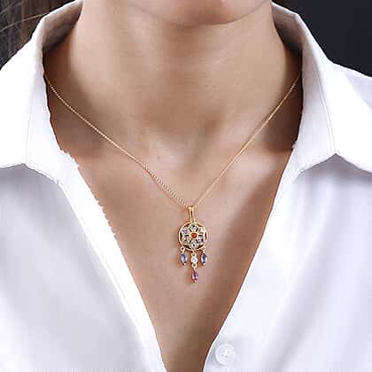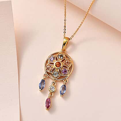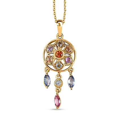 Orange Sapphire, Multi Sapphire & Natural Zircon Dream Catcher Pendant with Chain (Size - 20) in 18K Vermeil Yellow Gold Plated Sterling Silver 1.64 Ct.