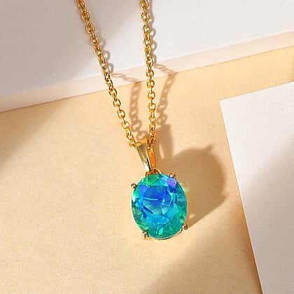 Peacock Quartz in 18K Vermeil Yellow Gold Plated Sterling Silver Solitaire Pendant with Stainless Steel Chain (Size 20) 3.17 Ct, Silver Wt. 5.11 GM