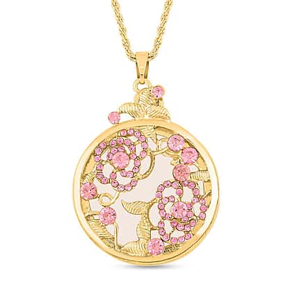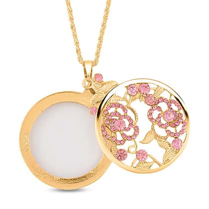 Pink Austrian Crystal and Magnifying Glass Pendant with Chain (Size 24-2 Inch Extender) in Yellow Gold Tone