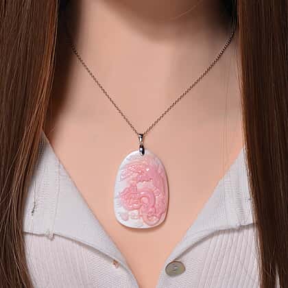 Pink Conch Shell Carved Garuda and Naga Pendant with Chain (Size 20) in Rhodium Overlay Sterling Silver 135.00 Ct
