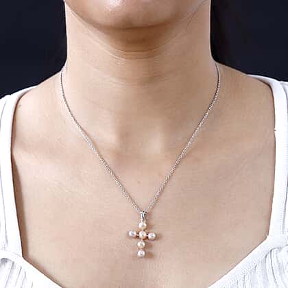 - The cross pendant is embellished with 6 Pink Freshwater Pearl Rounds in 5-6mm, Cabochon Cut