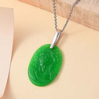 Platinum Overlay Green Jade Pendant with Steel Chain (Size 20) 22.000 Ct.