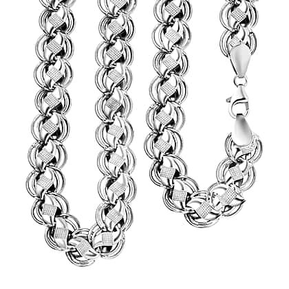 Get a solid look for every party with this sterling necklace. The hardiness of this chain comprises braiding of solid links, interconnected, along with the intersection of a small and large oval link. The beautiful artwork on each link makes this chain a magnet for appreciation. The layering of platinum provides a beautiful shine to this chain. This sterling silver chain will drape your neckline with a personality booster charm.